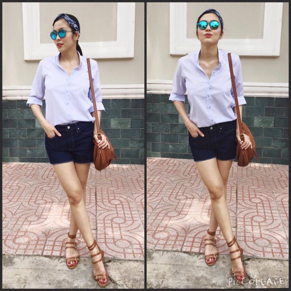 Hay ở một set đồ khác, cô chọn shorts jeans xanh đậm mix cùng sơ mi xanh nhạt chất liệu mỏng mát. Cô kết hợp bộ đồ trẻ trung này với túi và sandals da nâu, đồng thời đeo headband họa tiết và kính tráng gương đậm chất mùa hè.