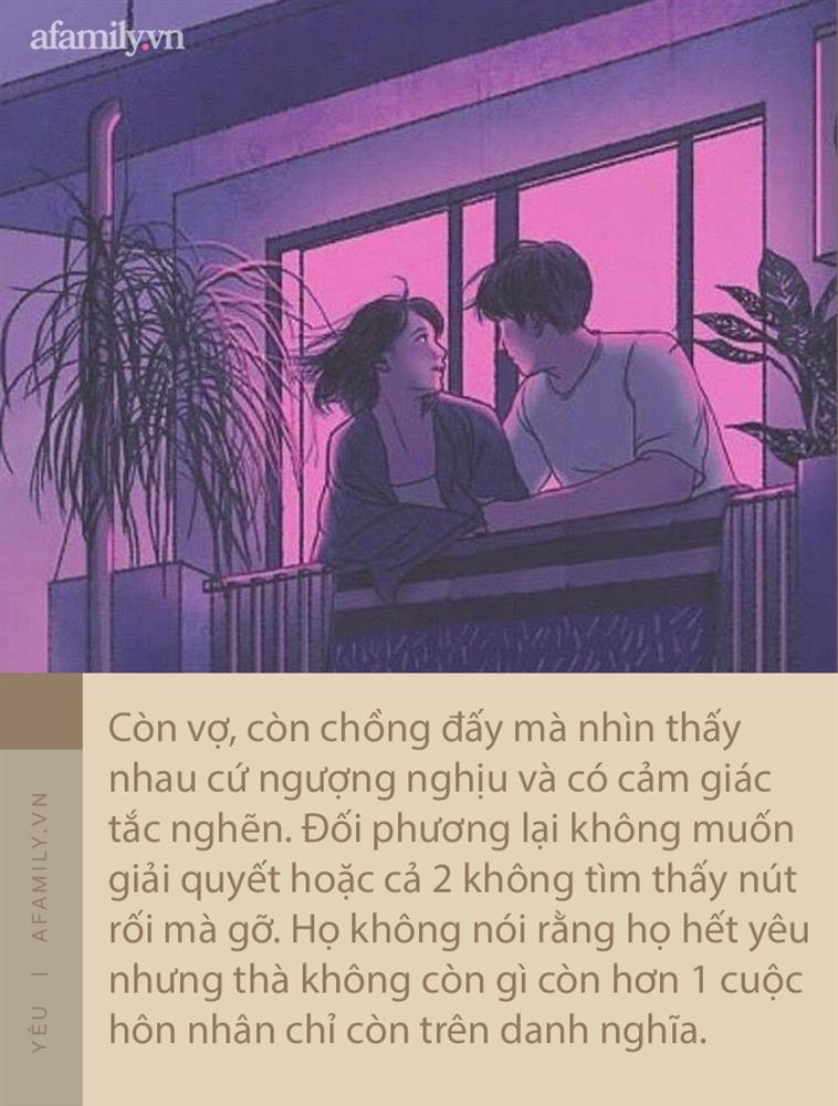 Còn vợ, còn chồng đấy mà nhìn thấy nhau cứ ngượng nghịu và có cảm giác tắc nghẽn. Đối phương lại không muốn giải quyết hoặc cả 2 không tìm thấy nút rối mà gỡ. Họ không nói rằng họ hết yêu nhưng thà không còn gì còn hơn 1 cuộc hôn nhân chỉ còn trên danh nghĩa.