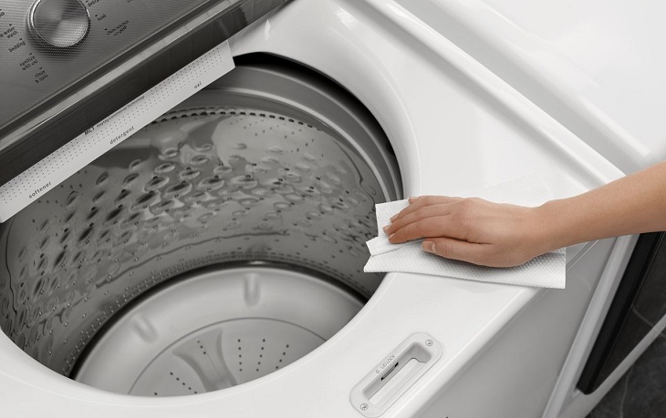 Đối với máy giặt cửa trước, bạn hãy dùng khăn giấy để lau chùi miếng cao su viền quanh khung cửa. Trước tiên là lau bên ngoài, rồi lật lên lau ở bên trong. Đối với máy giặt cửa trên, bạn hãy sử dụng miếng xốp bọt biển (miếng rửa chén) để cọ sạch những cặn bẩn còn sót lại trong khoang chứa xà phòng cùng với ngăn chứa nước giặt, sau đó lau sạch bề mặt máy bằng vải hoặc khăn giấy.