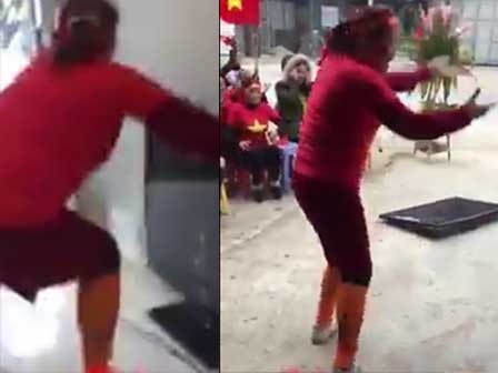 Vì quá vui mừng trước bàn gỡ hòa 1-1 của Quang Hải, một bà mẹ đã bê hẳn tivi ra đường để đập ăn mừng.