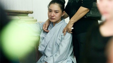 Dù rất đau buồn trước sự ra đi vĩnh viễn của chồng nhưng Kiều Oanh vẫn cố gắng không khóc, cô đứng im lặng và luôn tụng kinh cầu nguyện cho linh hồn của chồng.