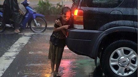 Dân mạng nghẹn lòng trước bức ảnh em bé nép mình bên ô tô để trú mưa