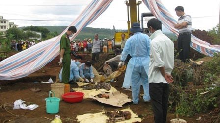 Sau khi vứt xác vợ chồng nạn nhân xuống hố, hung thủ còn ném theo tôn, gạch, đá, cây, lá cà phê hòng “đào sâu chôn chặt” tội ác của mình.