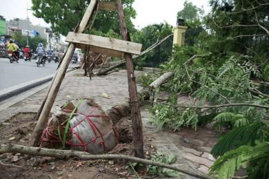 Sáng nay 14.6, theo ghi nhận của phóng viên, nhiều tuyến đường tại Hà Nội như Nguyễn Quyền, Trần Quốc Toản (quận Hai Bà Trưng) vẫn ngổn ngang cây gãy đổ vì chưa được thu dọn kịp. Các công nhân phải túc trực 24/24 nhằm ngăn các phương tiện đi vào khu vực nguy hiểm.