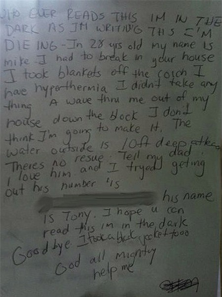 Bức thư có nội dung như sau: “Tôi xin thông báo với bất cứ ai đọc được bức thư này rằng tôi sắp chết. Tên tôi là Mike - 28 tuổi. Tôi đã đột nhập vào ngôi nhà này. Tôi cũng đã lấy đi chiếc chăn để trên ghế sofa. Thân nhiệt của tôi đang hạ dần. Ngoài ra tôi không lấy đi thứ gì khác.