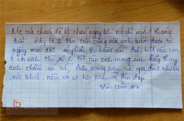 " Chào em gái có tấm lòng nhân hậu, anh rảnh được vài phút nghỉ trưa tranh thủ viết vội cho em lá thư vì ít hôm nữa sẽ có bạn anh đến thăm. Chắc có lẽ em ngạc nhiên lắm, anh suy nghĩ không biết giờ này con gái anh đang làm gì, nó có quấy rối em không? Thực ra anh đã điều tra rất kỹ về em và quyết định đặt con gái anh trước nhà em là quyết định đúng đắn nhất mà anh từng làm vì cuộc đời anh từ khi sinh ra chỉ toàn là sai lầm. anh mồ côi cha mẹ từ nhỏ, anh không được giáo dục tốt nên nhiều lần anh lầm đường lỡ bước khiến các sơ nuôi anh rất vất vả. Anh chỉ có vợ lúc mình giàu có còn lúc anh nghèo khó người ta bỏ anh mà đi em à! Con gái anh giống anh như hai giọt nước, ai cũng nói vậy nên em nhìn nó em sẽ hình dung ra được anh, nhưng em không có cơ hội gặp anh nữa rồi.