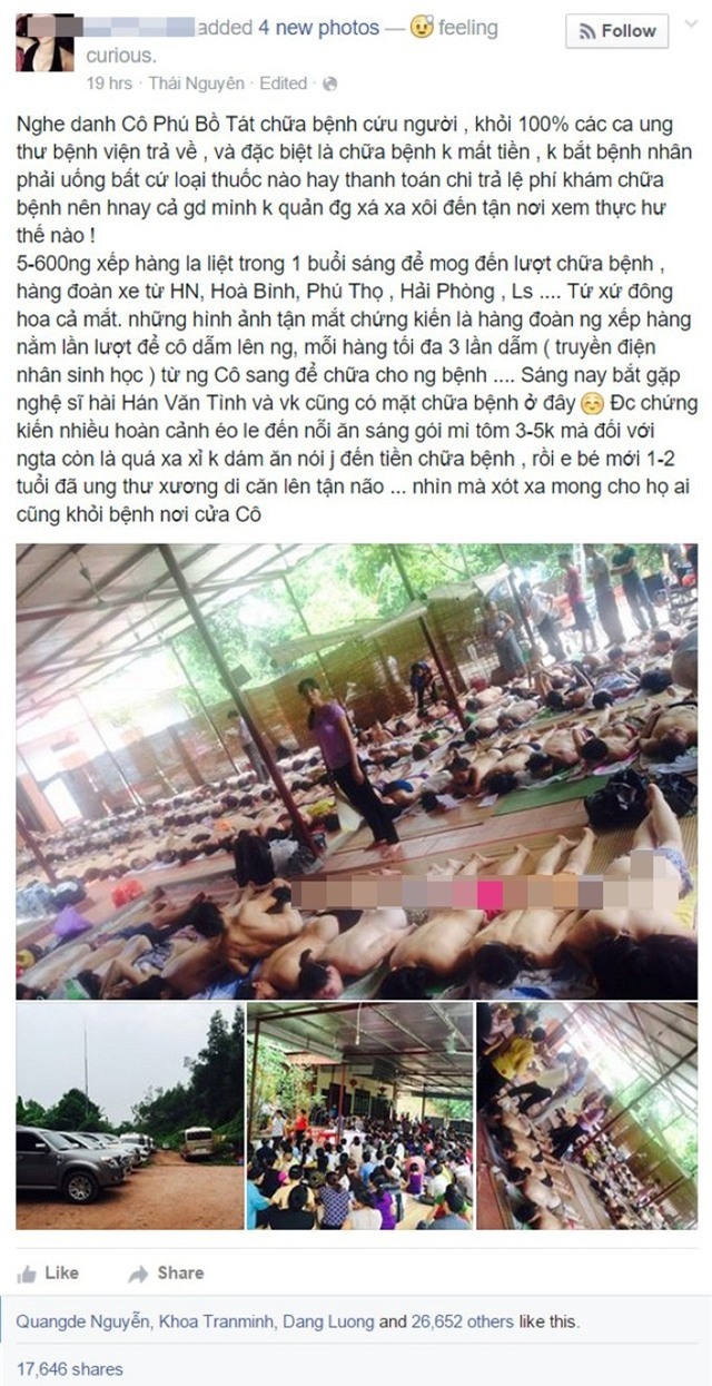 Nói về diễn biến bệnh tình cũng như cảm nhận sau khi đến "cơ sở mát-xa, tẩm quất" của "cô Phú", diễn viên phim "Đất và người" chia sẻ: "Bản thân tôi lên đó mấy tháng rồi thì thấy việc xoa bóp, truyền năng lượng cũng góp phần giải tỏa được phần nào tâm lý lo lắng khi mang bệnh trong người. Thực hư chuyện chữa bệnh khỏi hay không thì tôi không chắc chắn nhưng với người bệnh, liệu pháp tâm lý cũng rất quan trọng".