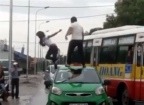 Từ chiều 11/7, mạng xã hội facebook lan truyền đoạn clip ghi lại hình ảnh một cô gái mặc áo trắng cộc tay, quần jean đứng trên nóc xe taxi la hét, đập phá bị tài xế đánh ngã lăn xuống đất.