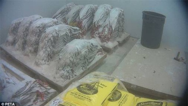 Sau khi đã bị lột da lưng, cá sấu sẽ bị ném vào các thùng đá như thế này. |