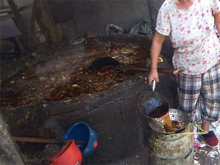 Những chất thải từ cống rãnh này sẽ được cho lên một cái chảo to để chế biến thành dầu cùng với nội tạng động vật thối rữa. Dầu “cống rãnh” sau khi chưng cất xong sẽ được tuồn cho các nhà hàng chiên, xào đồ ăn với giá cực hời.