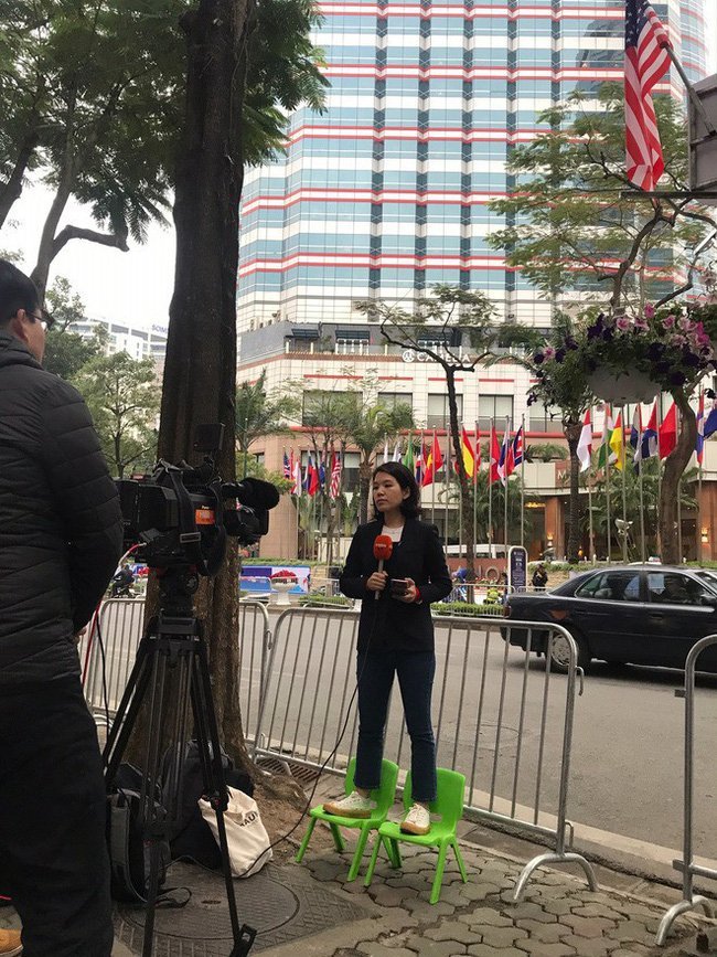 | Tại Hội nghị thượng đỉnh Mỹ - Triều diễn ra đầu năm nay, rất nhiều khoảng khắc thú vị sau hậu trường của các BTV truyền hình quốc tế được nhiều người chụp lại. Với chiều cao khiêm tốn, một nữ phóng viên dùng ghế đứng vừa giúp tôn dáng lại lấy được cảnh nền đẹp nhất. |