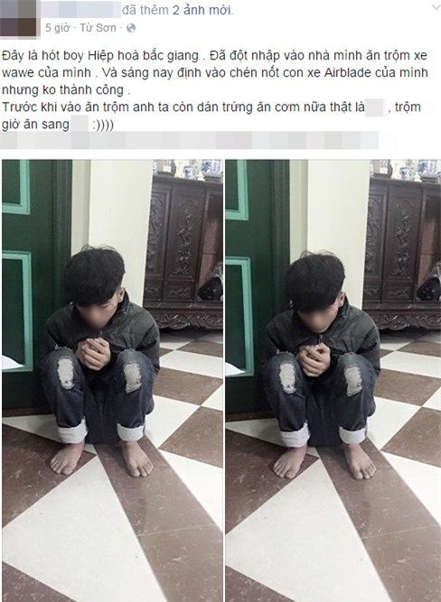 Chủ nhà cho biết: "Tên trộm này tên là Học, sinh năm 1998. Đợt trước nhà mình đã bị mất một chiếc xe Wave không ngờ suýt nữa thì mất nốt Airblade. Hôm qua, nó đã lẻn vào nhà mình rồi. Mình biết vì phát hiện dấu chân trên tường, Vì biết trước như vậy nên mình đã rình để bắt.