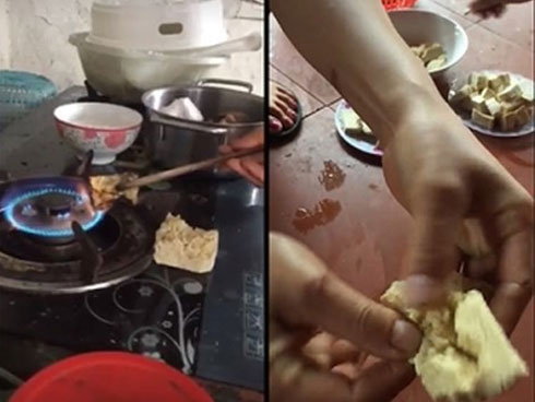 Hình ảnh đậu phụ bóp không nát nhưng đốt lại cháy (ảnh cắt từ clip).