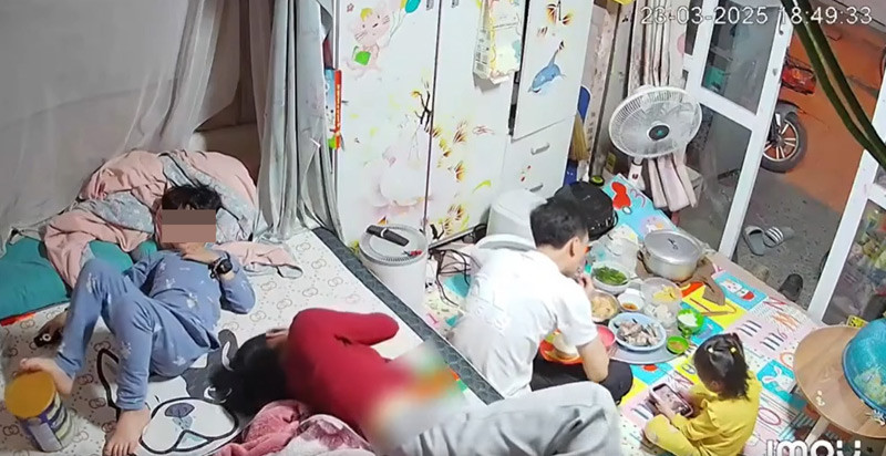 Đoạn video được trích từ camera gia đình cho thấy khoảnh khắc người phụ nữ đau bụng đến nỗi nằm vật ra giường quằn quại. Bên cạnh, người chồng vẫn ngồi bên mâm cơm đút cho con gái ăn, còn người con trai chăm chú xem ti vi.