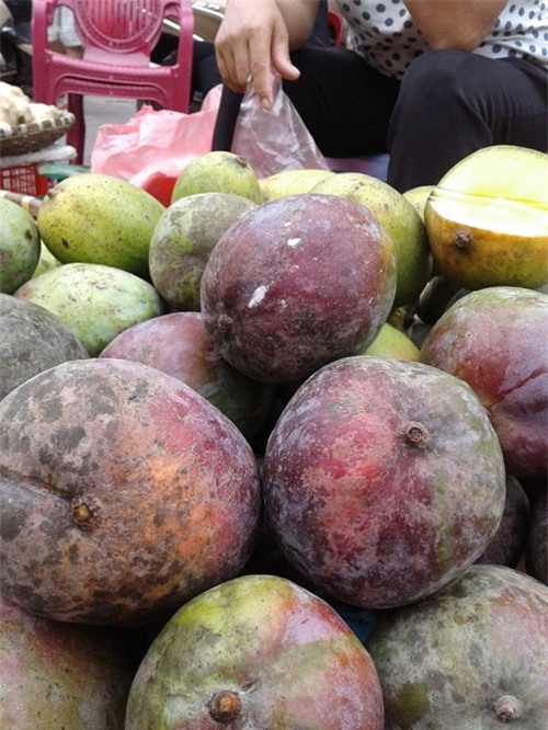 Quả xoài tím được bán tại chợ Nghĩa Tân (Cầu Giấy), một nửa vỏ đã chuyển sang màu tím. Ảnh: Nông Thuyết |