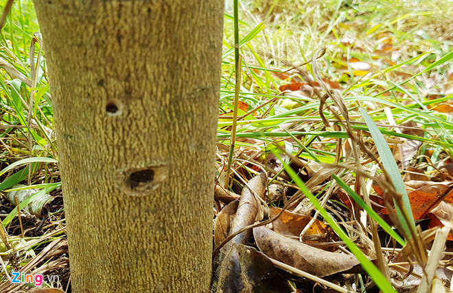 Một gốc cam 3 năm tuổi ở huyện Phụng Hiệp (Hậu Giang) được "vô nước biển" 2 lần. Trong đó, lỗ khoan phía trên vừa được rút ống tiêm. Ảnh: Việt Tường.