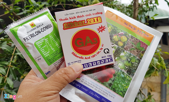 Các loại phân vi lượng và thuốc kích thích cây trồng mà phóng viên Zing.vn được cửa hàng nông dược bán để mang về chích cây. Những mặt hàng này nằm trong danh mục được thuốc phép sử dụng trên cây trồng. Ảnh: Việt Tường.