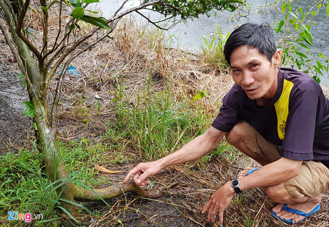 Ông Lương Văn Kết ở huyện Mỹ Tú (Sóc Trăng) chỉ lỗ khoan để chích nông dược vào thân cây cam sau nhà. Ảnh: Việt Tường.