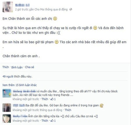 Khoảng 15h chiều 1/9, trên một trang Facebook khác của mình, nhân vật “quăng bom” trên đã đưa ra lời xin lỗi: “Em chân thành xin lỗi các anh chị. Sự thật là hôm qua em chỉ thấy dì chạy xe bị cướp rồi ngất đi, và đưa đến bệnh viện. Chứ không to tát như em ghi đâu. Em xin hứa sẽ không bao giờ tái phạm”.