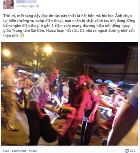 Ngay lập tức, câu chuyện đáng sợ này đã trở thành tâm điểm chú ý, bàn luận và được chia sẻ, like bởi rất nhiều thành viên mạng xã hội Facebook. Nhiều trang diễn đàn, fanpage khác cũng đăng lại câu chuyện này với những cái title như “Sài Gòn ghê quá”, “Sợ quá, chặt tay cướp điện thoại giữa phố”…