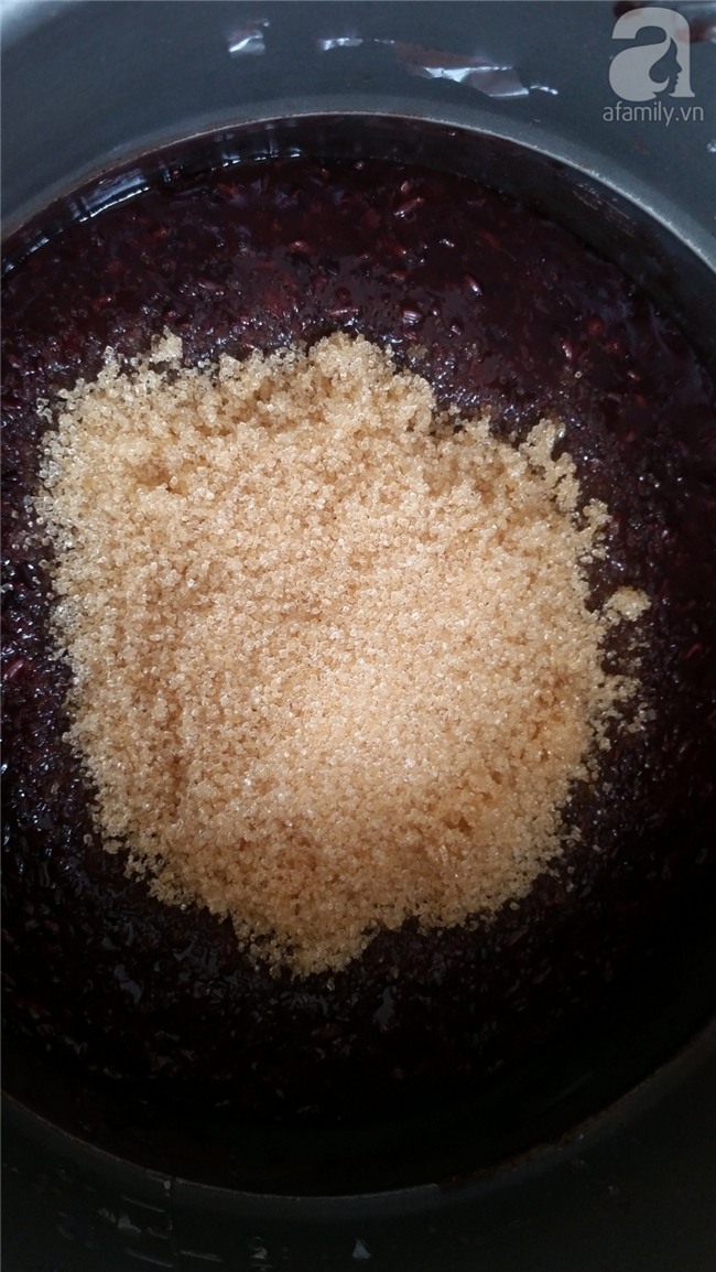 Khi thấy hạt nếp cẩm mềm nhừ, nước sánh đặc thì cho đường vào khuấy đều. Độ ngọt tùy theo khẩu vị. Để nếp cẩm sôi thêm 5 phút thì tắt bếp, để nếp cẩm nguội.