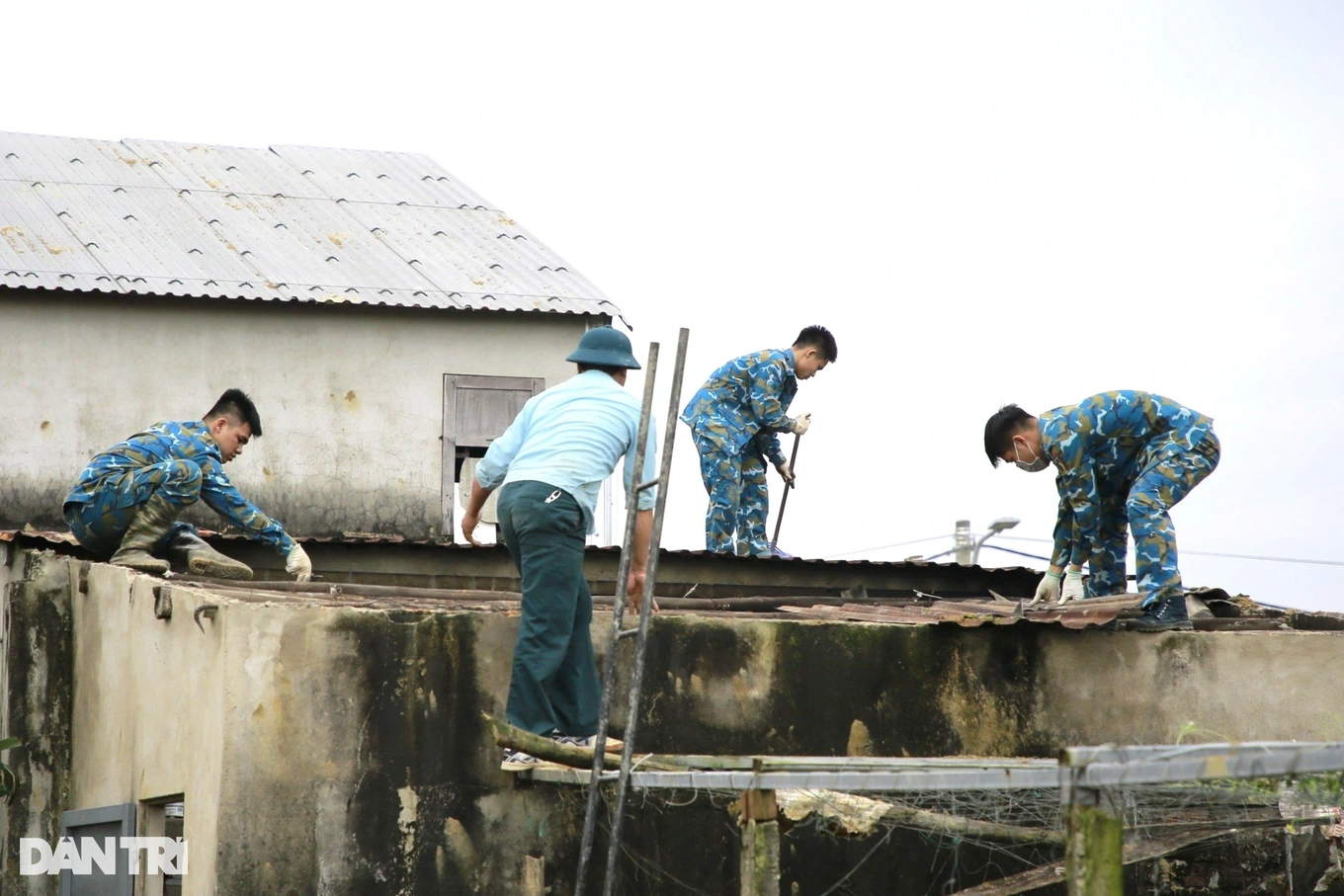 Lực lượng bộ đội tiến hành sửa chữa lại nhà hư hỏng cho người dân (Ảnh: Công Bính).