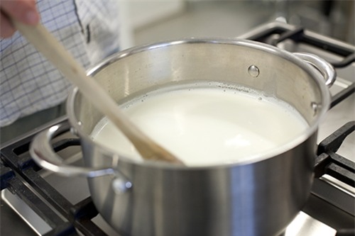 - Đổ 500ml sữa vào nồi rồi đun nóng lên (không cần sôi) dưới ngọn lửa nhỏ. Hoặc bạn cũng có thể quay sữa trong lò vi sóng chừng 1 phút.