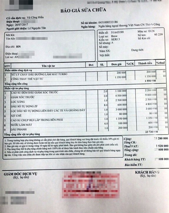 | Hóa đơn sửa chữa một thương hiệu xe sang |