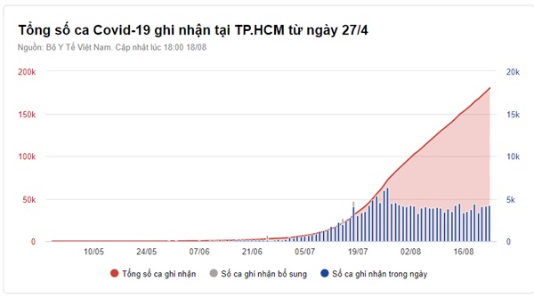 Năm tỉnh, thành phố ghi nhận số mắc cao là TP.HCM (180.245), Bình Dương (73.425), Đồng Nai (18.311), Long An (18.193), Tiền Giang (7.743).