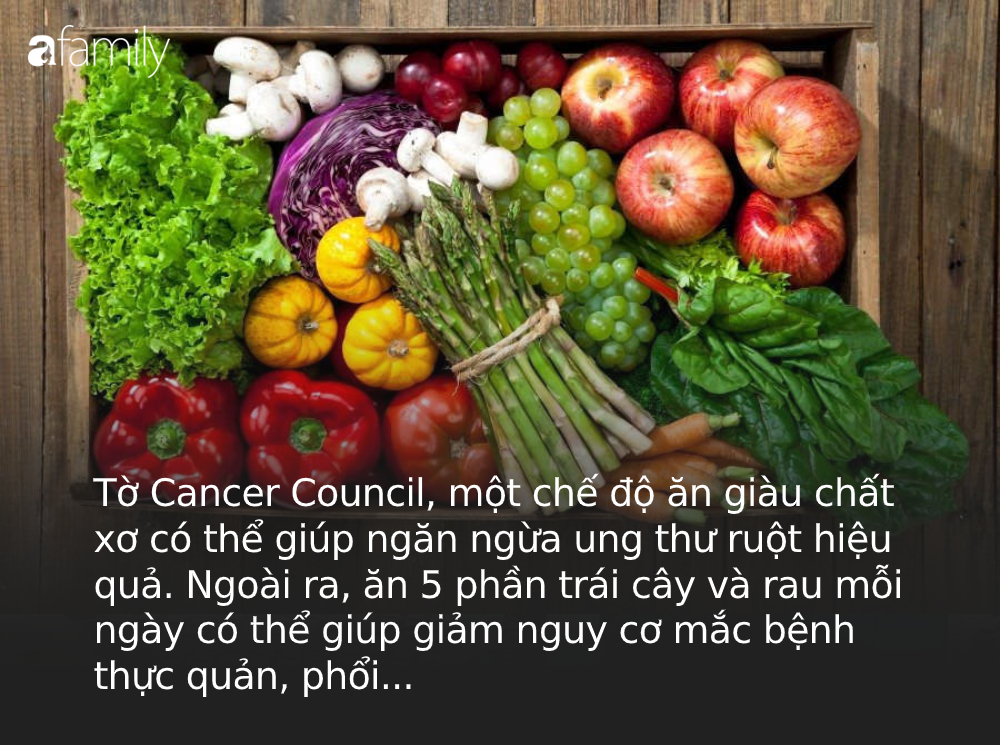 Tờ Cancer Council cho biết, một chế độ ăn giàu chất xơ có thể giúp ngăn ngừa ung thư ruột hiệu quả. Ngoài ra, ăn 5 phần trái cây và rau mỗi ngày có thể giúp giảm nguy cơ mắc bệnh thực quản, phổi và một số dạng ung thư miệng và cổ họng.