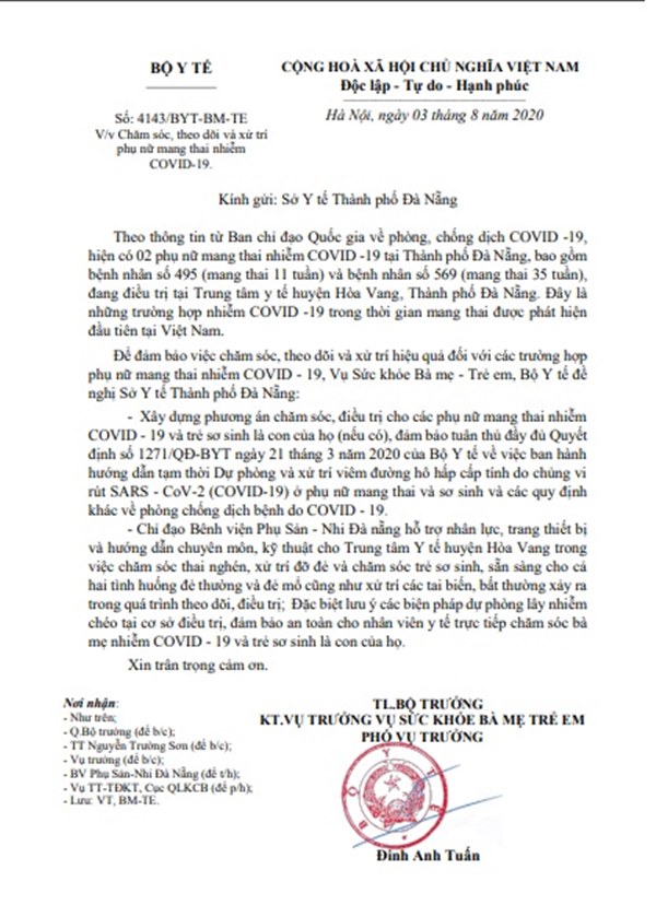 Đây là những trường hợp nhiễm COVID-19 trong thời gian mang thai được phát hiện đầu tiên tại Việt Nam. Để đảm bảo việc chăm sóc, theo dõi và xử trí hiệu quả đối với các trường hợp phụ nữ mang thai nhiễm COVID-19, Vụ Sức khỏe Bà mẹ - Trẻ em, Bộ Y tế yêu cầu Sở Y tế Thành phố Đà Nẵng xây dựng phương án chăm sóc, điều trị cho các phụ nữ mang thai nhiễm COVID-19 và trẻ sơ sinh là con của họ (nếu có), đảm bảo tuân thủ đầy đủ Quyết định số 1271/QĐ-BYT ngày 21 tháng 3 năm 2020 của Bộ Y tế về việc ban hành hướng dẫn tạm thời Dự phòng và xử trí viêm đường hô hấp cấp tính do chủng vi rút SARS-CoV-2 (COVID-19) ở phụ nữ mang thai và sơ sinh và các quy định khác về phòng chống dịch bệnh do COVID-19.
