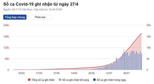 Tính đến 7/8, Việt Nam có 200.715 ca nhiễm trong đó có 2.339 ca nhập cảnh và 198.376 ca mắc trong nước. Số ca nhiễm mới ghi nhận trong nước của đợt dịch kể từ 27/4 đến nay là 196.806 ca, trong đó có 63.863 bệnh nhân đã được công bố khỏi bệnh.