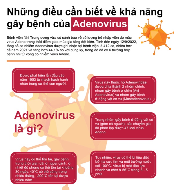 Adenovirus đang là nguyên nhân khiến nhiều trẻ phải nhập viện với triệu chứng như viêm đường hô hấp, tiêu chảy, viêm kết mạc... Tính đến ngày 12/9/2022, tổng số ca nhiễm được ghi nhận tại bệnh viện là 412 ca, trong đó có 6 trường hợp bệnh nhi tử vong do virus này.