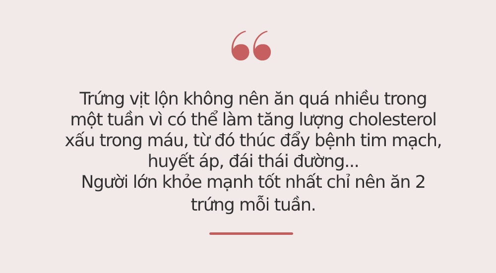 Trứng vịt lộn dù thơm ngon, bổ dưỡng nhưng không nên ăn quá nhiều trong một tuần vì có thể làm tăng lượng cholesterol xấu trong máu, từ đó thúc đẩy bệnh tim mạch, huyết áp, đái thái đường...
