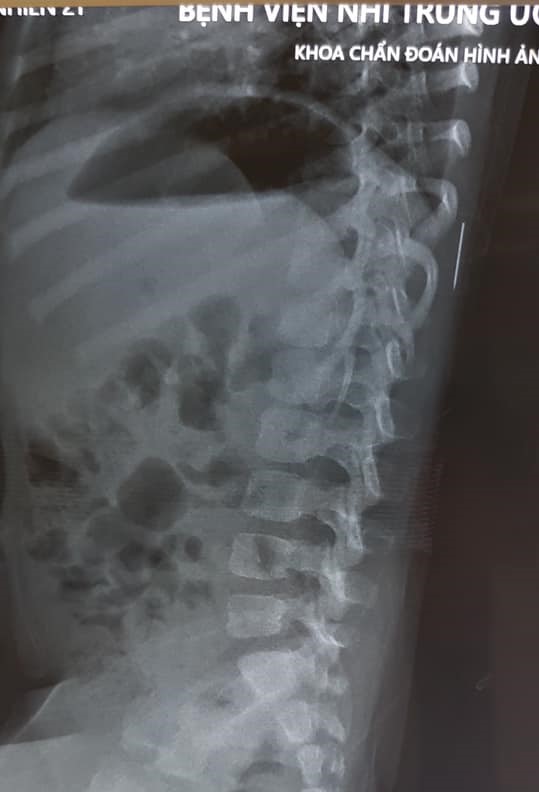 Tại Bệnh viện Nhi Trung ương, trong quá trình thăm khám, các bác sĩ đã tiến hành cho cháu chụp X-quang và phát hiện có dị vật trong phần mềm vùng cơ lưng trái, đốt sống 11.