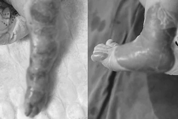Theo lời kể của gia đình, bệnh nhi là con lần 1, được sinh mổ tại trung tâm y tế huyện khi được 39 tuần thai, cân nặng lúc sinh 3,6 kg. Tuy nhiên, ngay sau sinh, toàn bộ cẳng chân, bàn chân 2 bên của bệnh nhi bị trợt loét, mất những mảng da xung quanh, rỉ nhiều dịch.