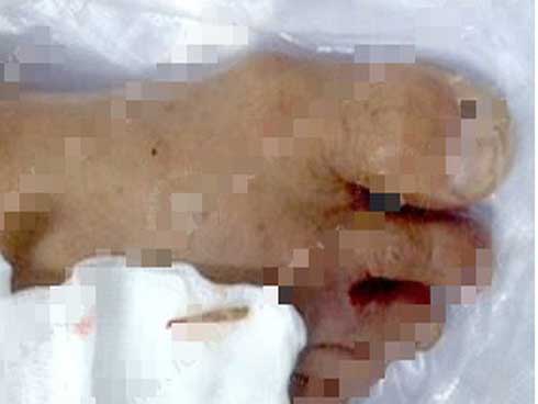 Khi rạch ra, tiến hành nặn ở lỗ mở thấy có một cấu trúc màu trắng như mủ nhưng sờ thấy chắc. Tiếp tục lau sạch thì phát hiện đó là một cây dằm gỗ.