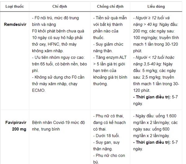 Đối với thuốc kháng virus Remdesivir, Bộ Y tế cũng quy định thời gian điều trị F0 là 5-7 ngày. Thời gian điều trị bằng thuốc này theo hướng dẫn trước đó là 5 ngày.