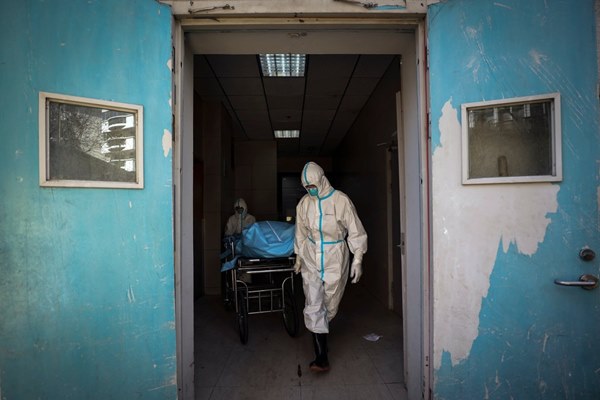 Nhân viên y tế đưa bệnh nhân tử vong ra khỏi một bệnh viện ở Vũ Hán. Ảnh: AP.