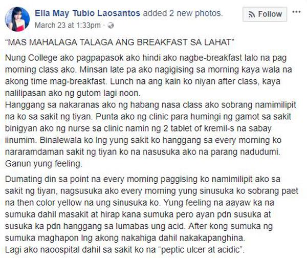 Bữa sáng là bữa ăn quan trọng nhất trong ngày, nó cung cấp năng lượng cho cơ thể của bạn trong cả một ngày bận rộn. Một cô gái trẻ xinh đẹp tên Ella Laosantos đã chia sẻ bài học mà bản thân phải nhận để hiểu được tầm quan trọng của việc ăn sáng mỗi ngày.