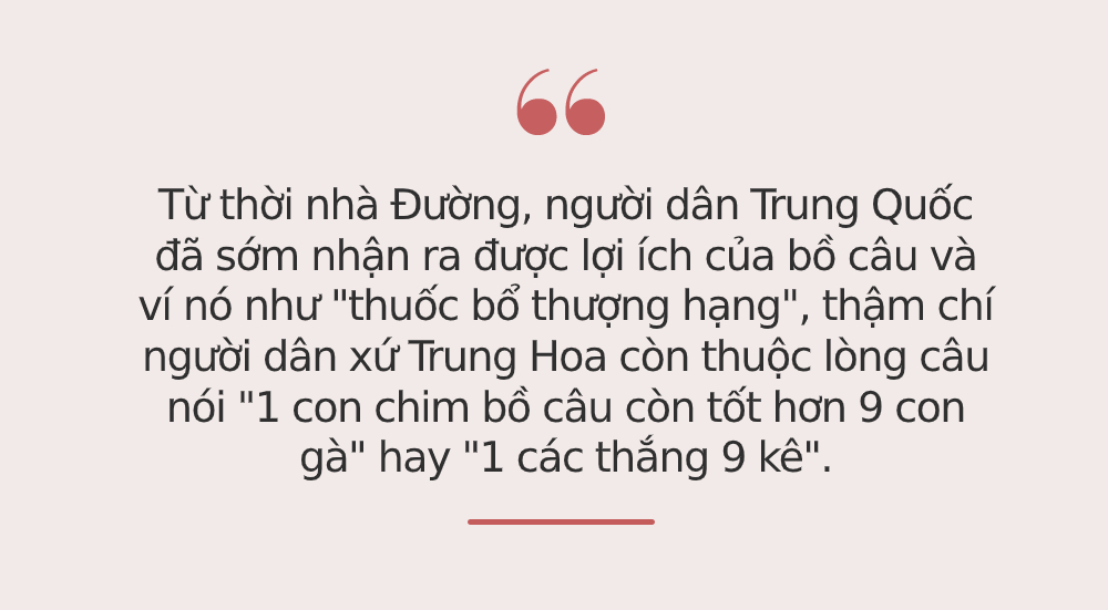 Từ thời nhà Đường, người dân Trung Quốc đã sớm nhận ra được lợi ích của bồ câu và ví nó như "thuốc bổ thượng hạng", thậm chí người dân xứ Trung Hoa còn thuộc lòng câu nói "1 con chim bồ câu còn tốt hơn 9 con gà" hay "1 các thắng 9 kê".