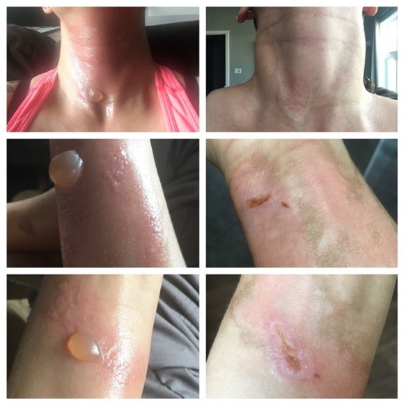 Ngày tiếp theo, cô thấy vùng da được bôi tinh dầu giống như bị phát ban. Ban đầu cô cho rằng cô bị dị ứng loại bột giặt mới mua. Nhưng trong 2 ngày tiếp theo, vùng da đó phồng rộp lên, gây đau vì bỏng hóa học. Khi đi khám, bác sĩ khẳng định rằng cô bị phỏng hóa chất độ 2 đến độ 3 do phản ứng với tia cực tím. Dù bên ngoài lọ tinh dầu có ghi hướng dẫn sử dụng rằng "tránh ánh nắng mặt trời trong vòng 12 giờ sau khi sử dụng" nhưng Elise không chú ý hay đọc điều này.