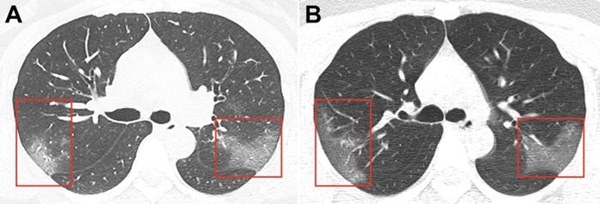 Hình chụp CT hai lá phổi của một bệnh nhân nữ 33 tuổi ở Lan Châu, Trung Quốc. Trong hình A, có nhiều "đốm trắng" mờ như thủy tinh ở thùy phải và sau đỉnh thùy trái. Hình B là phổi chụp sau 3 ngày theo dõi bệnh nhân. Nó cho thấy những đốm trắng ngày càng lan rộng bên trong phổi người bệnh, "xâm chiếm" đỉnh sau thùy phải và sau đỉnh của thùy trái. Ảnh: RSNA.