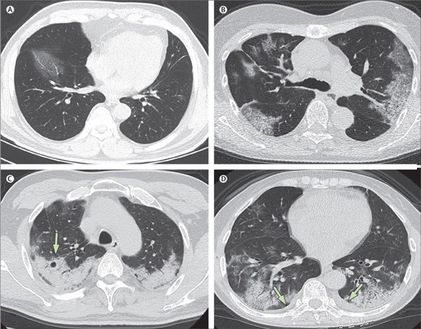 Hình CT chụp phổi của các bệnh nhân Covid-19 tại Trung Quốc.Hình A: Bệnh nhân nam 56 tuổi, ngày thứ 3 sau khi khởi phát triệu chứng, phổi xuất hiện các đốm trắng từ vách liên sườn đến nội nhãn ở thùy dưới bên phải. Hình B: Bệnh nhân nữ 74 tuổi, ngày thứ 10 sau khi khởi phát triệu chứng: hai bên phổi dày đặc những đốm trắng chứng tỏ sự xâm chiếm và phá hủy nặng của virus corona tới các phế nang. Hình C: Nữ bệnh nhân 61 tuổi, ngày 20 sau khi khởi phát triệu chứng: phổi bị bao phủ bởi lớp trắng mờ đục dày, các phế nang bên trong đã bắt đầu biến đổi. Hình D: Nữ bệnh nhân 63 tuổi, ngày 17 sau khi khởi phát triệu chứng: hai bên phổi xuất hiện lớp đốm trắng dày trong phế quản ở cả thùy dưới lẫn thùy trên, đã có hiện tượng tràn dịch màng phổi. Ảnh: The Lancet.