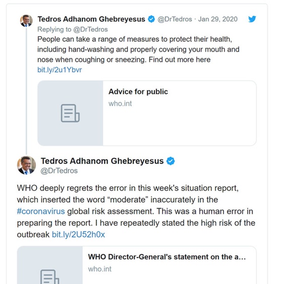 Trên Twitter, ông Ghebreyesus cho biết tổ chức này "rất hối hận" về cái mà ông gọi là "lỗi của con người" trong các báo cáo của WHO tuần trước đã đề cập đến nguy cơ bùng phát toàn cầu là "vừa phải" thay vì "cao".