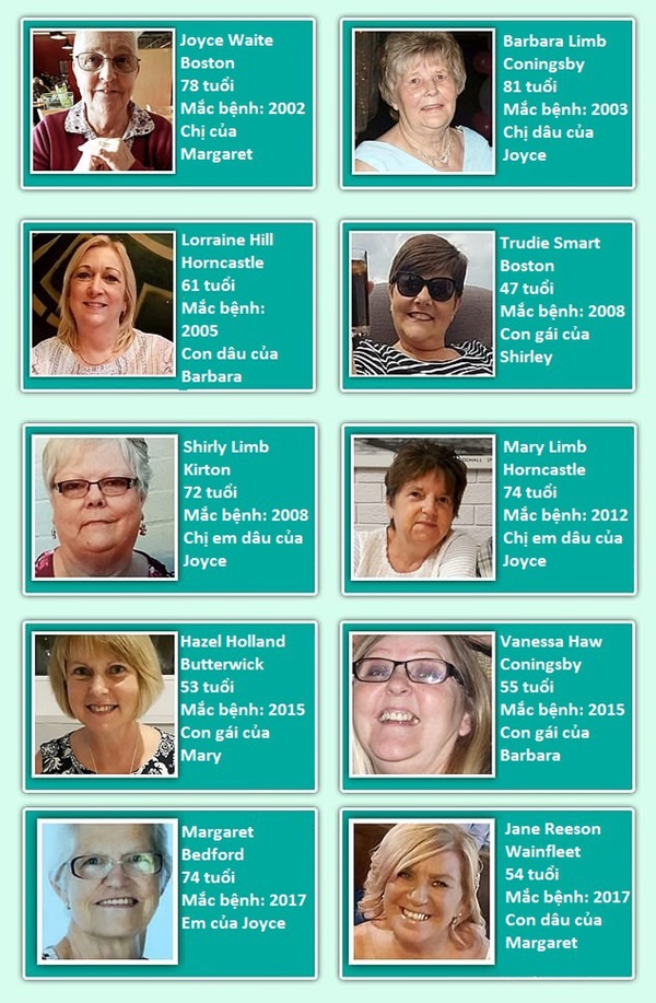 Mười thành viên trong một gia đình đến từ Lincolnshire (Anh) có độ tuổi từ 47-81, trong đó 8 người có quan hệ huyết thống đã lần lượt phát hiện mắc bệnh ung thư vú trong 15 năm. Nhưng điều lạ kỳ hơn là tất cả đều được điều trị thành công.