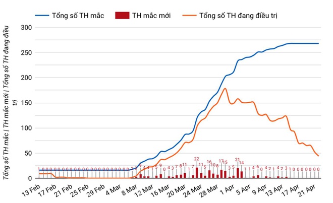 Tính đến 18h ngày 23/4, Việt Nam ghi nhận tổng cộng 268 bệnh nhân mắc Covid-19, trong đó có 160 người từ nước ngoài, chiếm 59,7% và 108 người lây nhiễm trong cộng đồng chiếm 40,3%. Hiện, nước ta có 224 bệnh nhân đã được công bố khỏi bệnh. Số ca có kết quả xét nghiệm 1 lần âm tính với SARS-CoV-2 là 12 ca, 2 lần âm tính với SARS-CoV-2 là 8 ca.