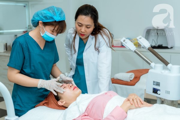 BS Nhung đang giám sát quá trình chăm sóc da của kỹ thuật viên tại cơ sở của mình.