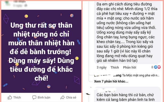 Mới đây, mạng xã hội xôn xao với lời đồn thổi dùng máy sấy, tiêu đường chữa bệnh ung thư. Cụ thể, một chủ tài khoản tên T.M đăng tải: "Ung thư rất sợ thân nhiệt nóng. Nó chỉ muốn thân nhiệt hàn để dễ bành trướng. Dùng máy sấy. Dùng tiêu đường để khắc chế".