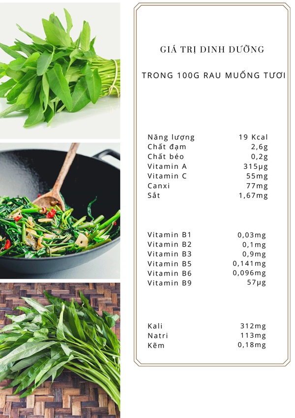 Cùng với đó, rau muống cũng rất giàu các loại vitamin và khoáng chất khác nhau. Trong 100g rau muống tươi có chứa thành phần dinh dưỡng như sau: